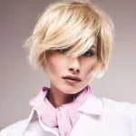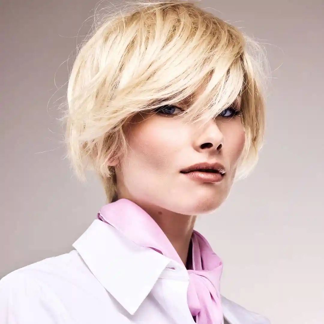 Un carré court déstructuré, texturisé par un effilage pour apporter mouvement et légèreté. La frange longue et asymétrique révèle un look messy-chic.
