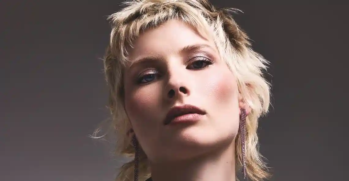 - Une coupe courte style mulet moderne, très dégradée et texturisée, avec une frange ultra-courte et des mèches effilées. Le dessus est volumineux et l’arrière plus long, pour un rendu rock, déstructuré et dynamique. L’audace du style est finalisée par un blond contrasté aux reflets nacrés.