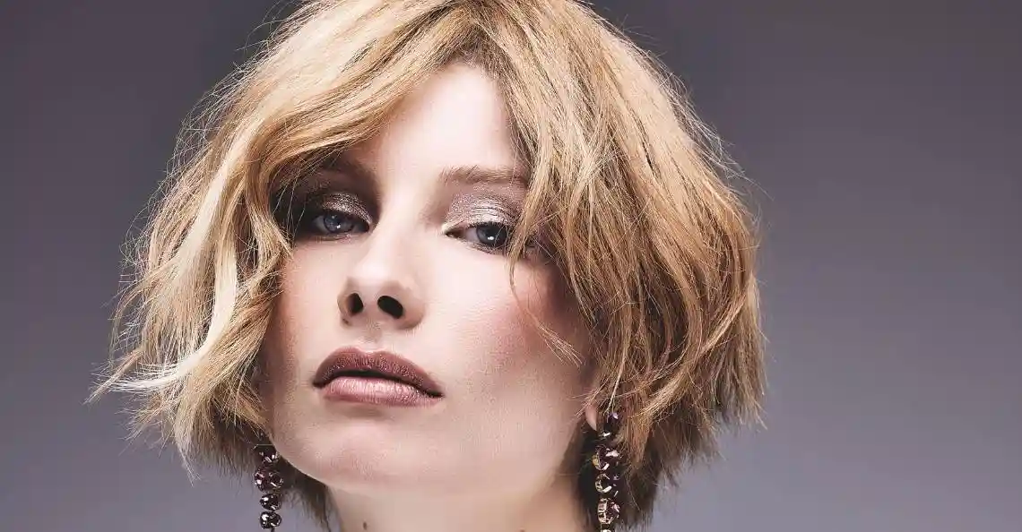 - Un carré court ondulé, très texturisé, avec une mèche souple sur le front. Le volume est créé par un léger dégradé, et un bandeau ornementé apporte une touche romantique et élégante. Blondeur iconique pour un style sexy assumé.